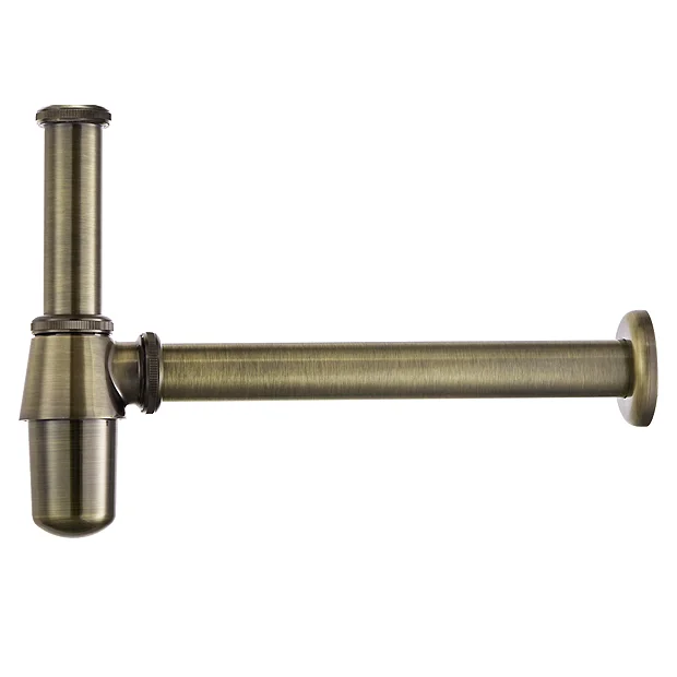 A traditional round shallow basin bottle trap in brushed antique brass with wall pipe and a round wall flange. Perfect for giving a classic vintage look at a real value for money price. This traditional basin bottle trap will help keep your wash space clean and odour-free by stopping gasses rising up through the drainage system. Its height can be adjusted to fit, while its solid brass construction is durable for years of use. Combine with one of our matching Chatsworth Antique Brass Taps (sold separately) for a perfectly harmonious traditional bathroom.