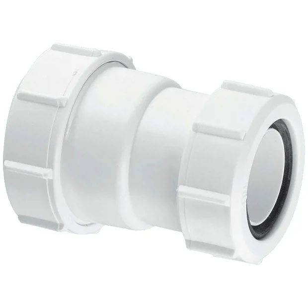 A 32mm x 40mm Multifit Straight Connector from McAlpine. Suitable for plastic, copper and lead pipes. Conforms to BS EN 1451-1:200 and BS EN 1329-1:2000.
